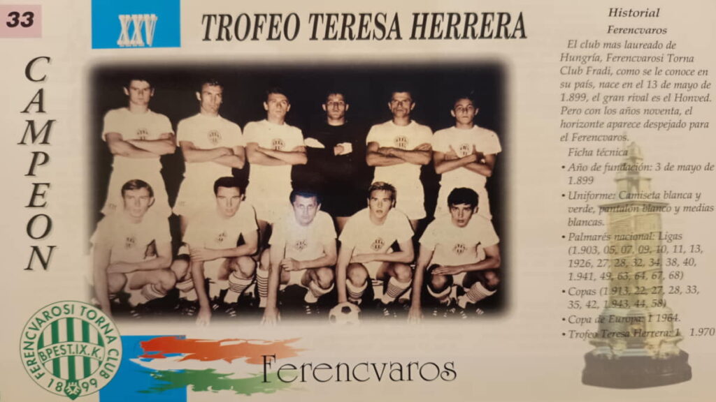 El Ferencvárosi que se presentó en A Coruña para enfrentarse al San Lorenzo de Almagro era un equipo desconocido para el gran público, pero que llevaba años llegando lejos en torneos europeos como la Copa de Ferias, competición cuya final alcanzó dos veces en la segunda mitad de la década de los 60.